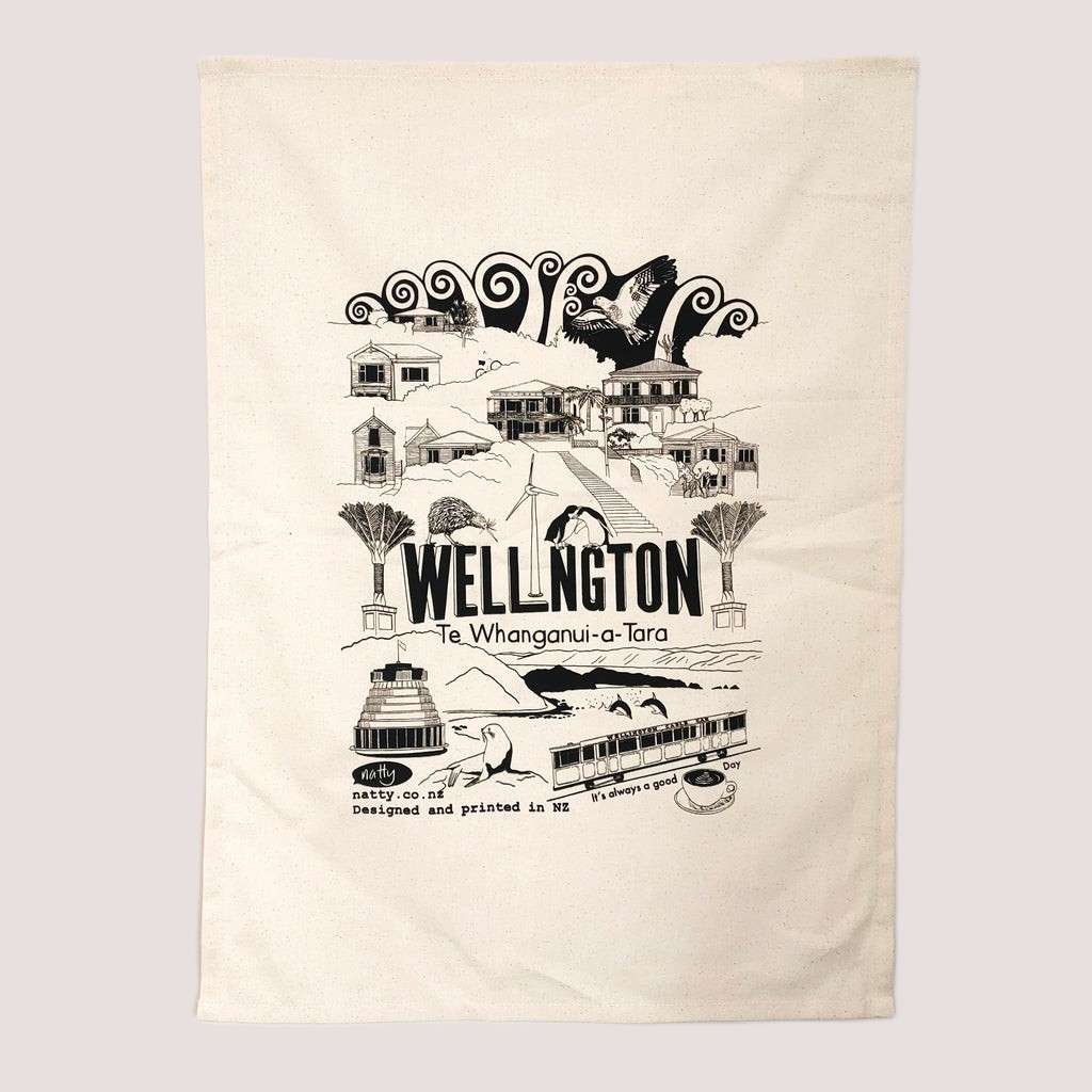 100 % natural (unbleached) ethically sourced cotton tea towel hand screen printed with Natty's hand drawn Wellington / Te Whanganui-a-Tara design.